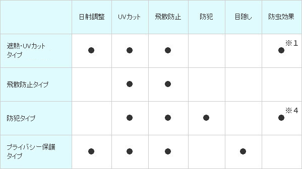 ※フィルムのタイプにより「日射調整」「飛散防止効果」の度合が異なります。